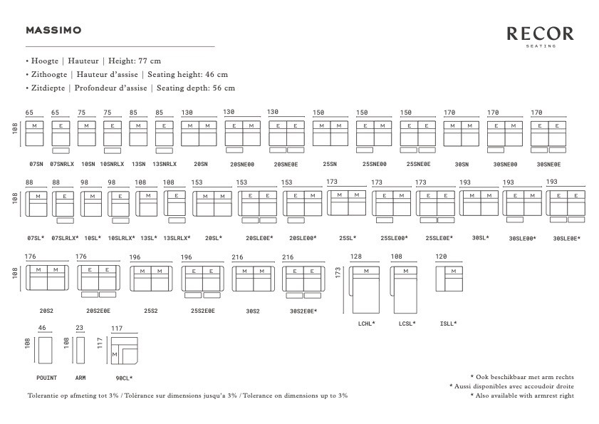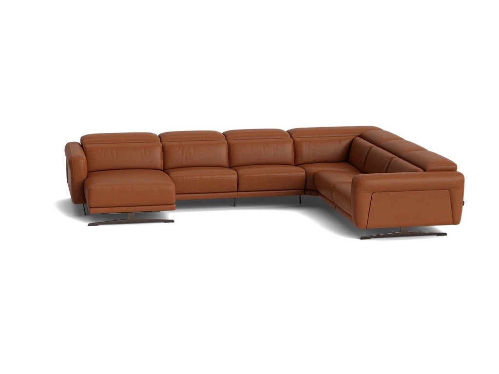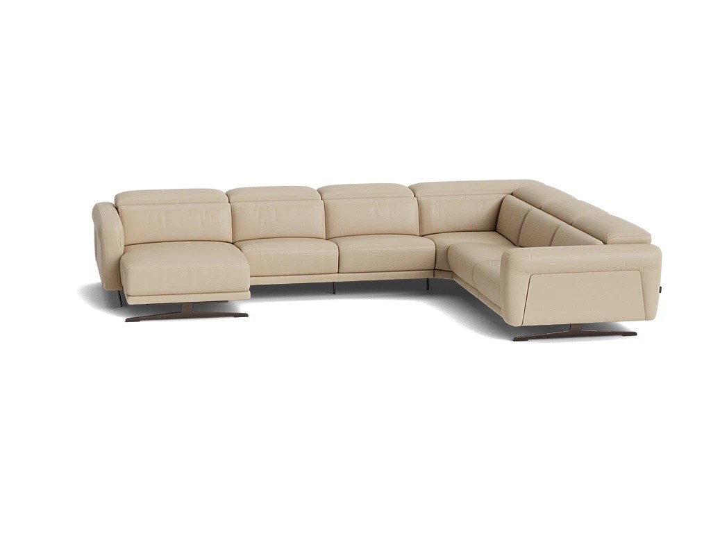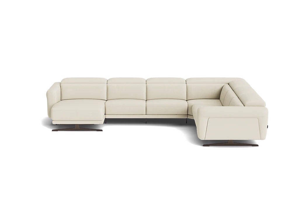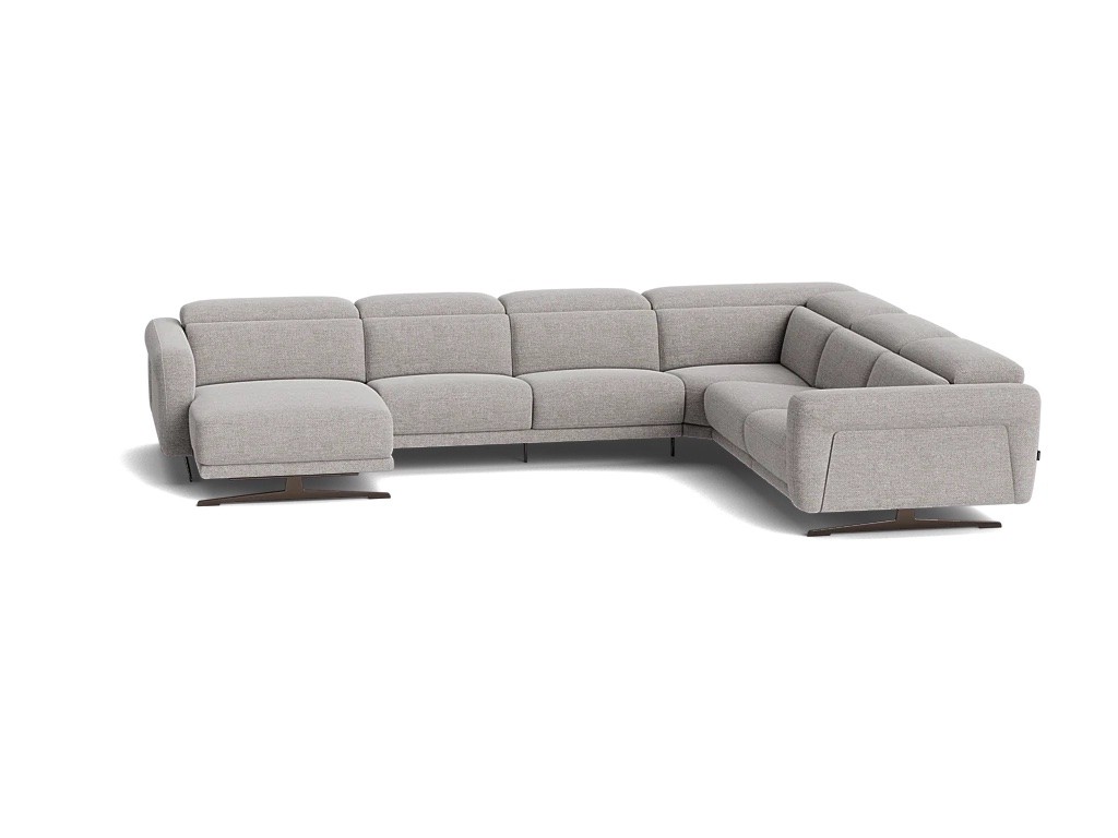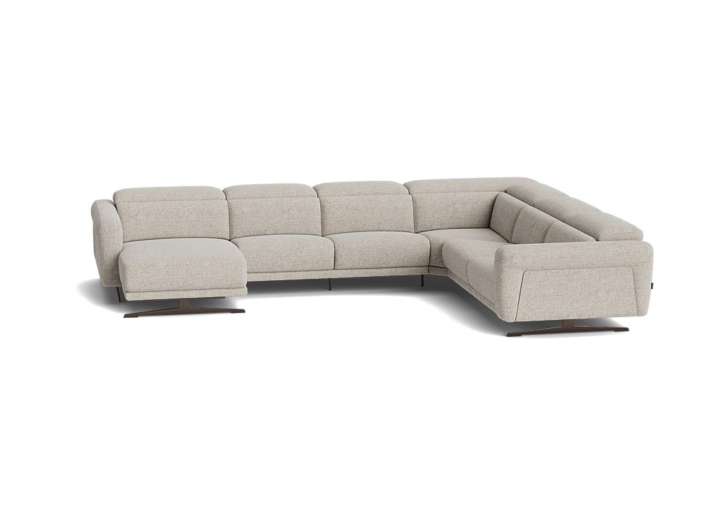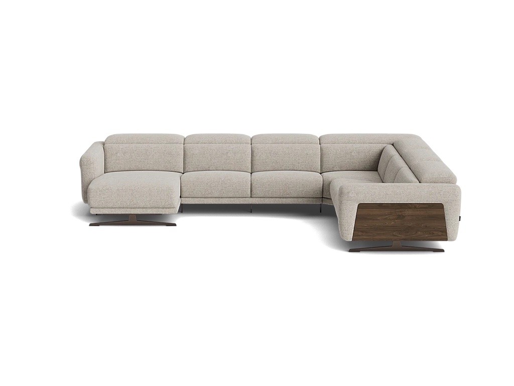 Modulaire zitbank met manueel verstelbare hoofdsteun. Verkrijgbaar met optionele relax met kantelfuncite, waarbij de de rugsteun, voetensteun en hoofdsteun apart elektrisch versteld kunnen worden. De bank is beschikbaar in stof of leder. De panelen in de armsteun kunnen in walnoot, stof of leder.